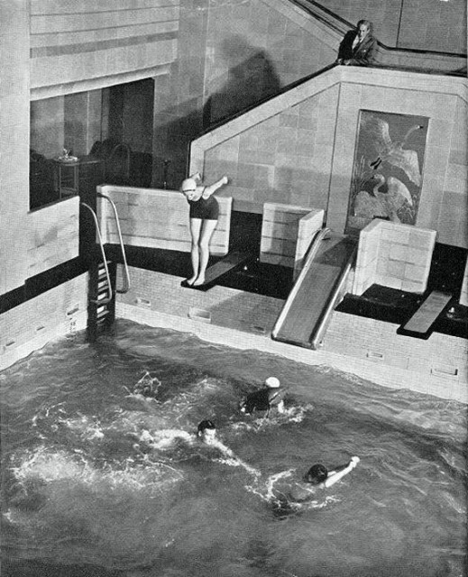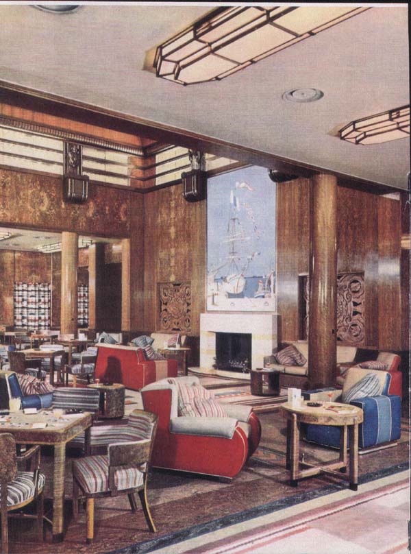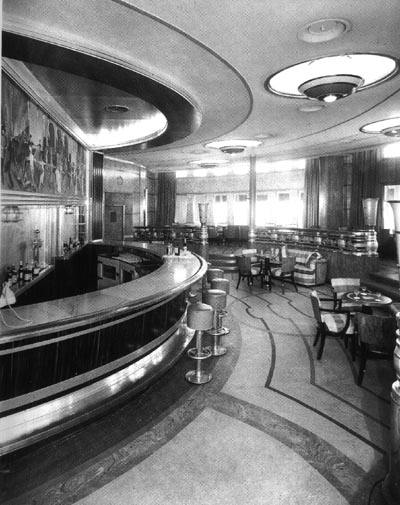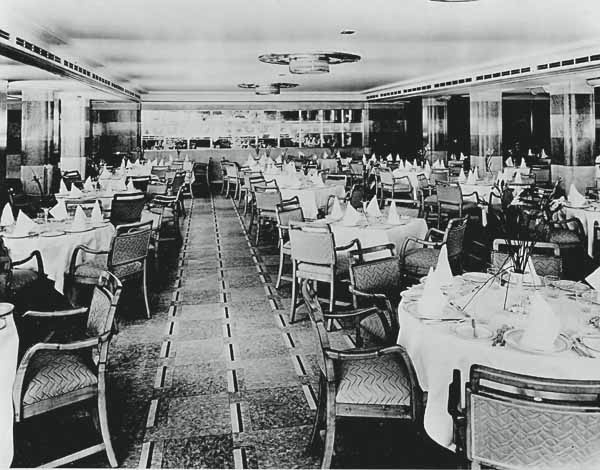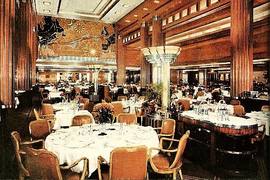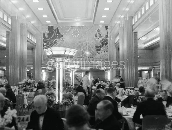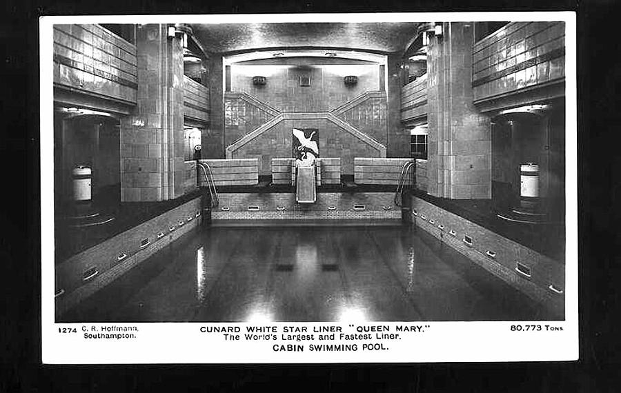 RMS Queen Mary exuded the elegance of a luxury hotel, housing all the necessities to live a life full of style, fine dinning and the best of company. The liner featured two indoor swimming pools, beauty salons, libraries and children’s nurseries for all three classes. Also featured was a music studio, lecture hall, telephone connectivity to anywhere in the world, outdoor paddle tennis courts and dog kennels. The largest room onboard was the first class main dining room (now known as “The Grand Salon”), spanning three stories in height and anchored by wide columns. (Our dinner reception will be held in the stunning Grand Salon.) The first class swimming pool also spanned over two decks in height. She was the first ocean liner to be equipped with it’s own Jewish Prayer Room (part of a policy to show that British shipping lines avoided the racism evident in Nazi Germany). One of the great features of the main dining room (Grand Salon) was a large map of the transatlantic crossing, with twin tracks symbolizing the winter/spring route (further south to avoid icebergs) and the summer/autumn route. During each crossing, motorized crystal models of the Queen Mary (identified by her 3 smokestacks) and the Queen Elizabeth (identified by her 2 stacks) would indicate the vessel’s progress en route. You’ll be able to enjoy that wonderful map during our dinner reception, as the band will be on a stage right below it. As an alternative to the main dining room, the Queen Mary featured the separate First Class “Verandah Grill” on the Sun Deck at the upper aft of the ship. The Verandah Grill was an exclusive a la carte restaurant with a capacity of approximately 80 passengers, and was converted into “The Starlight Club” at night. We will be having our joint bachelor party in the Verandah Grill and on the accompanying Verandah Grill deck on the Friday night before the wedding, so we invite all of our guests to join us for wonderful night of music and cocktails under the stars and in the Grill. Also on board, was the Observation Bar, an Art Deco Style lounge overlooking the front of the ship (which is still open and in operation today), two chapels, a synagogue, a hospital, and several children’s playrooms. Even a travel Bureau had been located on board for passengers to make hotel reservations before their arrival at their final destination. Twenty two different woods from various regions in the British Empire were used in her public rooms and staterooms. The ship is filled with some of the best examples of Art Deco decors in the world, and features a large number of original commissioned works of art throughout the ship. Accommodations ranged from fully equipped, luxurious first class staterooms and suites down to modest and cramped third class cabins. Today, none of the original third class cabins exist anymore, as they have been combined and converted into more luxurious hotel rooms on board. |