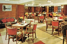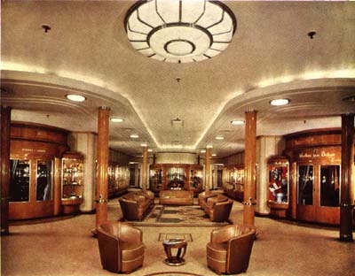Named after the famed section of London's Theatre District, Piccadilly Circus on the Queen Mary was the location of all of the specialty stores, where passengers could purchase current newspapers (printed on board), tobacco products, clothing, jewelry and various souvenir items. Located in the center forward part of the Promenade Deck, this was often a meeting place for passengers, as many of the popular locations on board could be reached from this area (The Observation Bar, the Ballroom, the First Class Smoking Room, etc.). Today, Piccadilly Circus is still a center of shopping on the ship, offering everything from genuine and tasteful souvenirs, all the way to the expected "less than tasteful" t-shirts and various other items that bring the ship a profit. As we love the Queen Mary so much, we've resolved ourselves to knowing that even the sale of touristy merchandise means profit for this very special ship - and profit means she continues to survive. |