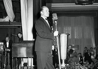 Bob Hope is seen here, entertaining audiences on board the Queen Mary in the First Class Ballroom (now known as The Queen's Salon). This room is just off of the enclosed Promenade Deck and can be visited during one of the many tours offered on board. |