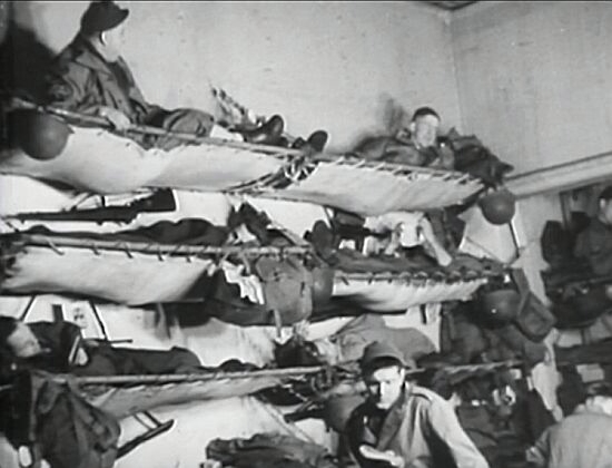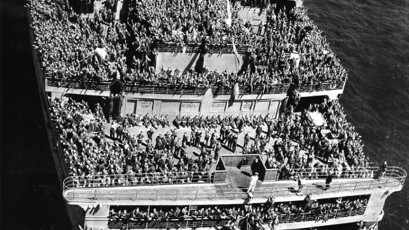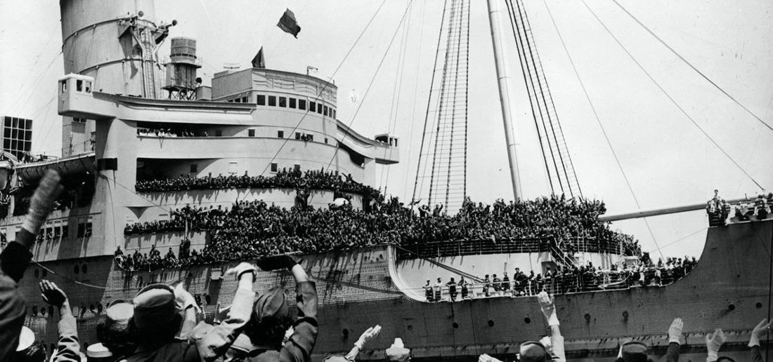 Upon her arrival in Sydney, her luxurious furnishings were all removed, and the conversion to “Troop Ship” began. To protect against magnetic mines, a degaussing coil was fitted around the outside of the hull. Inside, stateroom furniture and decoration were removed and replaced with triple-tiered wooden bunks (which were later replaced by standee bunks). Six miles of carpet, 220 cases of china, crystal and silver service, tapestries and paintings were removed and stored in warehouses for the duration of the war. The woodwork in the staterooms, the first-class dining room and other public areas was covered with leather. Every usable inch of the ship was put to use in some way to accommodate the large numbers of troops that she would transport. Even the large grand staircases were fitted with tiers of bunk beds. Queen Mary and Queen Elizabeth were the largest and fastest troopships involved in the war, often carrying as many as 15,000 men in a single voyage, and often travelling out of convoy and without escort. Their high speed made it difficult for U-boats to catch them. For protection, a number of small calibre guns were fitted, however, as it is said, her main protection was her impressive speed. |