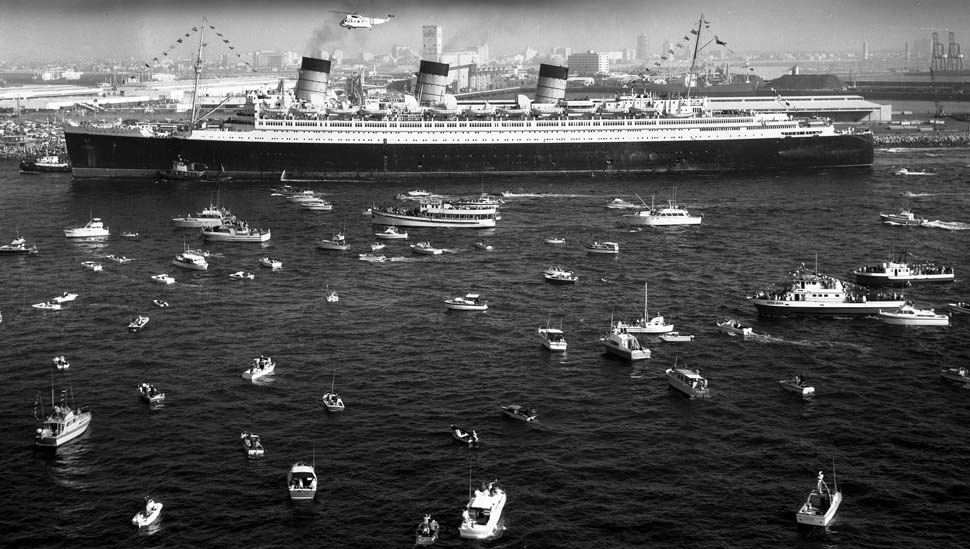 On December 9th, 1967, the Queen Mary arrived in Long Beach, California to much fanfare and celebration, following a 39-day voyage from England. The image below, of the auspicious arrival in Long Beach, ran the full width — and above the masthead — of the Los Angeles Times front page, with a story by staff writer Harry Trimborn, who reported: