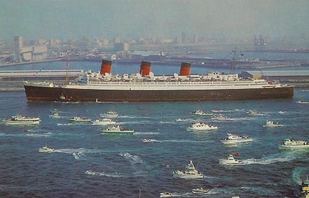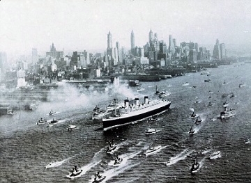 It would take precisely 4 days, 12 hours and 24 minutes for The Queen Mary’s maiden voyage to be concluded. Her arrival is one of the most celebrated in the history of New York, receiving the kind of reception and fanfare that only New York could generate. The harbour was filled with an awaiting armada of boats and fire tugs, with their water spouts spraying large fountains of water into the air. Thousands of well-wishers lined the shore, all hoping to catch sight of her auspicious arrival. Her maiden voyage had a total compliment of 1,849 passengers and 1,186 officers and crew, and thus she safely carried 3,035 souls across the Atlantic on her first voyage. |