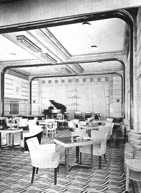 While not to the scale of the First Class Dining Room, the Second Class Dining Room had beautiful etched glass walls and very comfortable seating. The food was also known to be quite good, and would probably be better than most cruise lines would serve to their top paying passengers today. |