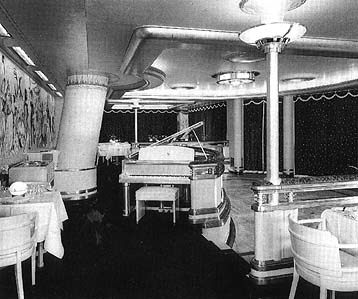Located off the Promenade Deck (very close to Piccadilly Circus) is the First Class Sitting room. You'll see from these pictures that there is a stage at one end of the room. The stage would be used by various lecturers, etc., during the day. But at night, the furniture would all be moved back, and a big band would take the stage, and First Class passengers would dance the night away in this very beautiful room. With the room being adjacent to the enclosed Promenade Deck, the ladies in their gowns and men in their tuxedos, could step out and get some air without being completely exposed to the elements. |