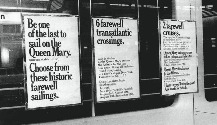 As the Cunard corporation was facing great economic loss by the mid-60's, the writing was on the wall: The era of the grand Ocean Liners was indeed over. Air flight had taken over the majority of the tourist market, and the public's interest in traveling the ocean in luxury had tragically waned. Cunard was in the process of building a new ship, the Queen Elizabeth 2 (which would come to be known as the famed QE2), and to pay for her construction, they mortgaged the rest of the fleet. The QE2 was smaller than her older sisters and could still provide some transatlantic service, but could also travel the world, visiting some of the smaller ports of call, thus beginning a era for ocean travel: cruising. But in this new market of "cruising" that was starting to gain some momentum, the public was not interested in the grand old ships. They were too big, too old fashioned, and couldn't travel to ports that would provide "resort-type" travel experiences. Cunard finally made the decision that the time had come to retire both the Queen Mary and the Queen Elizabeth from service, and sell them off to the highest bidder. The Queen Elizabeth met with a tragic end. Her post-Cunard life saw her privately owned, then a failed attempt at being a floating hotel (in the Florida Everglades), and finally converted into an Asian-based floating University. But sadly, she caught fire (some suspect arson), and sunk off the coast of Hong Kong, and was eventually sold to scrap. The Queen Mary, on the other hand, just barely avoided being turned to scrap. The Japanese scrap merchants that bid on her, came in just below a bid from the City of Long Beach, California. The city had plans to turn the Queen Mary into a grand tourist attraction and a city icon. The result would be the “Hotel Queen Mary,” convention and entertainment center and museum. As the Queen Mary was loved by millions around the world, the new owners hoped that she would become responsible for placing the City of Long Beach on the world map. The final price that the City of Long Beach paid for the legendary Queen Mary was $3.45 million. She arrived in Southampton for the last time on September 27, 1967, having just completed her 1000th Atlantic crossing. In her years of service, she had carried 2,112,000 passengers over 3,792,227 miles. And On October 31, 1967, 1,093 passengers and 806 crew set out on her last ever ocean voyage, which would take her on an epic journey around Cape Horn, and arrive in Long Beach on December 9th. |